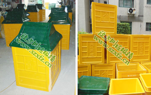 此款A02玻璃鋼屋形搖蓋垃圾桶規 格為:500*500*1000mmm.我司欣方圳玻璃鋼垃圾桶采用優質玻璃纖維與進口樹脂著色合成,它強度高,耐腐蝕,耐酸堿,抗老化,太陽暴曬下不變 形,抗紫外線,易清洗,操作方便,果皮箱收集容量大,堅固耐用使用壽命長,果皮桶無盜用和回收價值。潔凈、美觀、醒目、不退色。采用模具一次成型。密封性 好,不污染環境。有的是鍍鋅板內膽”。我司常年大量生產玻璃鋼垃圾桶,現在這里分享一下,我們該如何去選擇一家玻璃鋼垃圾桶廠家呢?小編在此從以下幾個方 面著手,公司的資質,公司的成立的時間,公司實地考察,生產產品的質量,產品的價格,交貨的日期等,這樣一大圈的走下來,眼見為實,耳聽為虛,誰家能勝任 一一知曉。