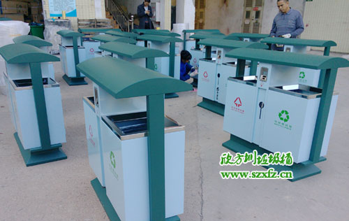 深圳龍崗區(qū)街道辦采購F95戶外鋼板分類垃圾桶,按照15天交貨日期,如期完工,送貨上門。此款F95戶外鋼板分類垃圾桶規(guī)格為:1000*400*1000.鋼制垃圾桶屋檐桶頭設(shè)計,防止雨水傾入內(nèi)桶。煙頭投口,分類垃圾,隔絕火患。有害投口,充分利用空間。桶兩邊都絲印有,標(biāo)志,字體,不可回收字樣,采用紅顏色。 標(biāo)志,字體,可回收字樣,采用綠顏色。巧妙的設(shè)計,結(jié)合城市人性化,更好服務(wù)城市居民。